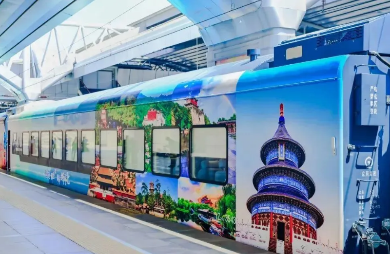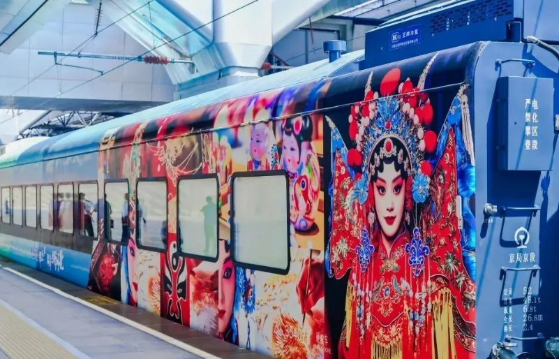 “星光·燕赵号”以“移动文化空间”为核心理念,集观光、餐饮、娱乐于一体,将河北大地的自然诗意融入车厢,实现从“交通工具”向“移动观景客厅”华丽蜕变。外观采用蓝色渐变色系设计,融入京剧等传统艺术图案、北京河北古建筑纹样和京津冀协同发展的现代图景等元素,通过差异化视觉叙事共同构建起流动的文化长廊。